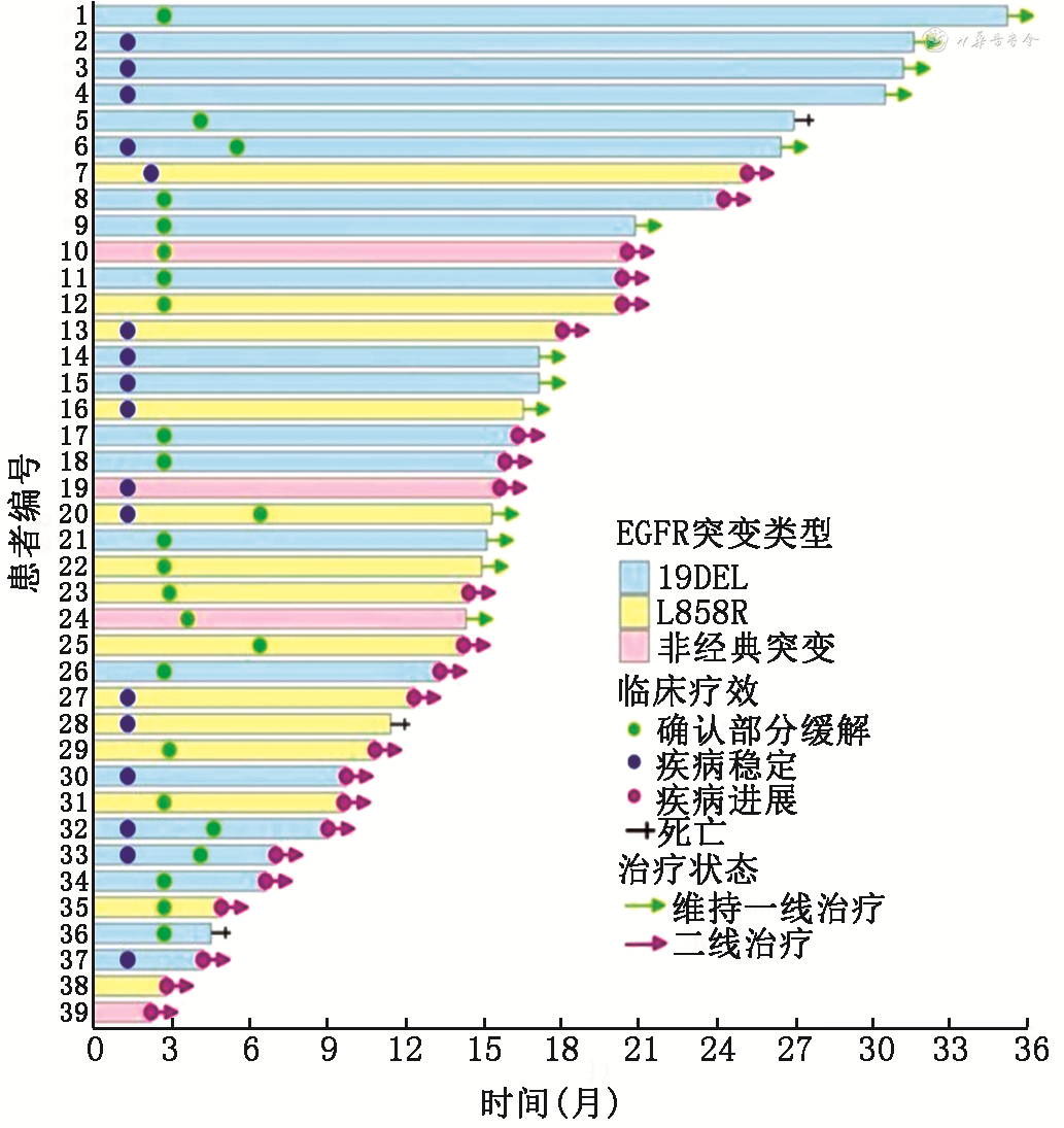 2. 治疗方法:39例EGFR突变晚期NSCLC患者一线均接受EGFR-TKIs联合化疗,具体为EGFR-TKIs与培美曲塞及含铂方案治疗,21 d为1个周期,根据患者耐受程度连续治疗4~6个周期后,采用序贯EGFR-TKIs与培美曲塞或靶向单药维持治疗,直至病情进展或出现不可耐受的不良反应。EGFR-TKIs包括吉非替尼、盐酸埃克替尼或阿法替尼。化疗药物为培美曲塞二钠和铂类(顺铂、卡铂或奈达铂)。
