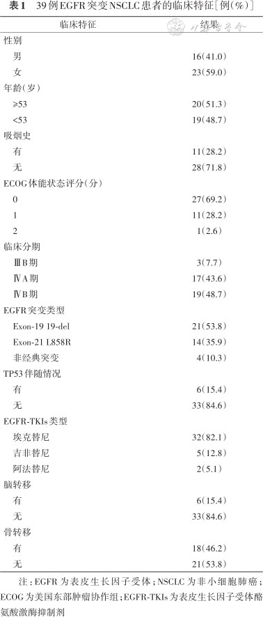 39例EGFR突变NSCLC患者的临床特征[例(%)]