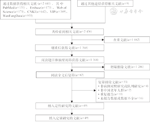 2. 排除标准:(1)非中国人群;(2)非病例对照或队列研究;(3)影响因素为基因型或影像学等一般体检或调查无法获得信息;(4)单纯描述性文献,如综述、个案报道、治疗或者护理经验总结等;(5)无法提取OR/RR值及其95%CI,或无法通过四格表数据计算得到OR/RR值及其95%CI的研究;(6)重复发表的研究;(7)重复报告的研究;(8)动物研究。