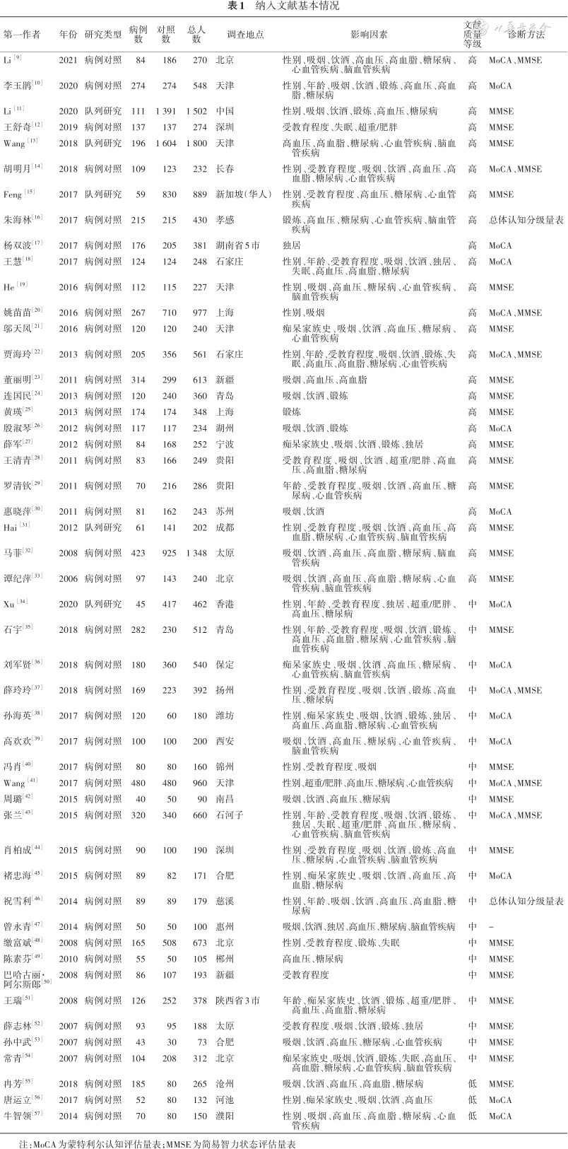 | 祝雪利[46] | 2014 | 病例对照 | 89 | 89 | 179 | 慈溪 | 性别、年龄、吸烟、饮酒、高血压、高血脂、糖尿病 | 中 | 总体认知分级量表 |
