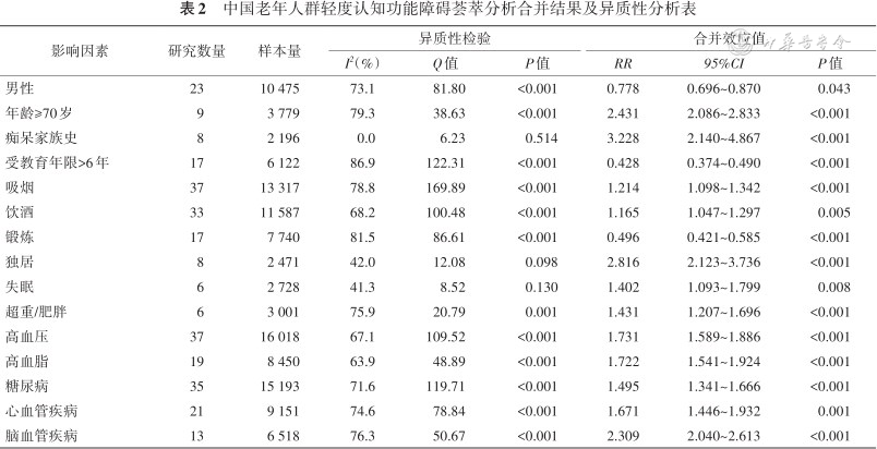 中国老年人群轻度认知功能障碍荟萃分析合并结果及异质性分析表