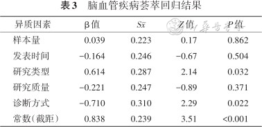分别对纳入研究≥10的影响因素(性别、教育、吸烟、饮酒、锻炼、高血压、高血脂、糖尿病、心血管疾病、脑血管疾病)进行荟萃回归,从样本量、文献发表时间、研究类型、研究质量及诊断方法中筛出导致异质性的因素。结果显示脑血管疾病的异质性因素为研究类型及诊断方式,其余因素荟萃回归均无统计学意义(表3)。