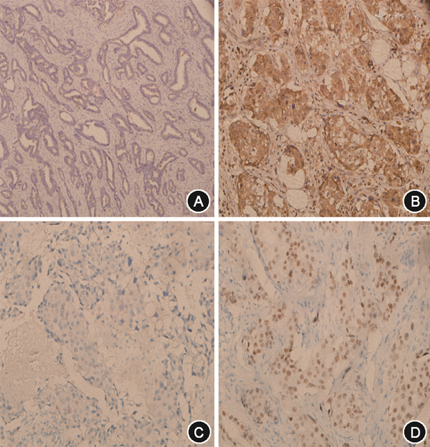 2. 结果判断:AR:细胞核内有棕黄色细颗粒者为阳性细胞,阳性细胞数<10%为阴性。AIB1在乳腺癌细胞胞质内呈棕黄色颗粒状着色。AIB1:对于癌细胞胞质着色的百分比和染色强度,每个样品半定量地评分为0~6。比例评分0:表示无染色,1:1%~10%,2:11%~50%,3:51%~100%。染色强度0表示阴性染色,1:弱,2:中度,3:强烈染色。将比例和强度评分相加,总评分从0到6。AIBI总评分≥5来定义为AIB1高表达。
