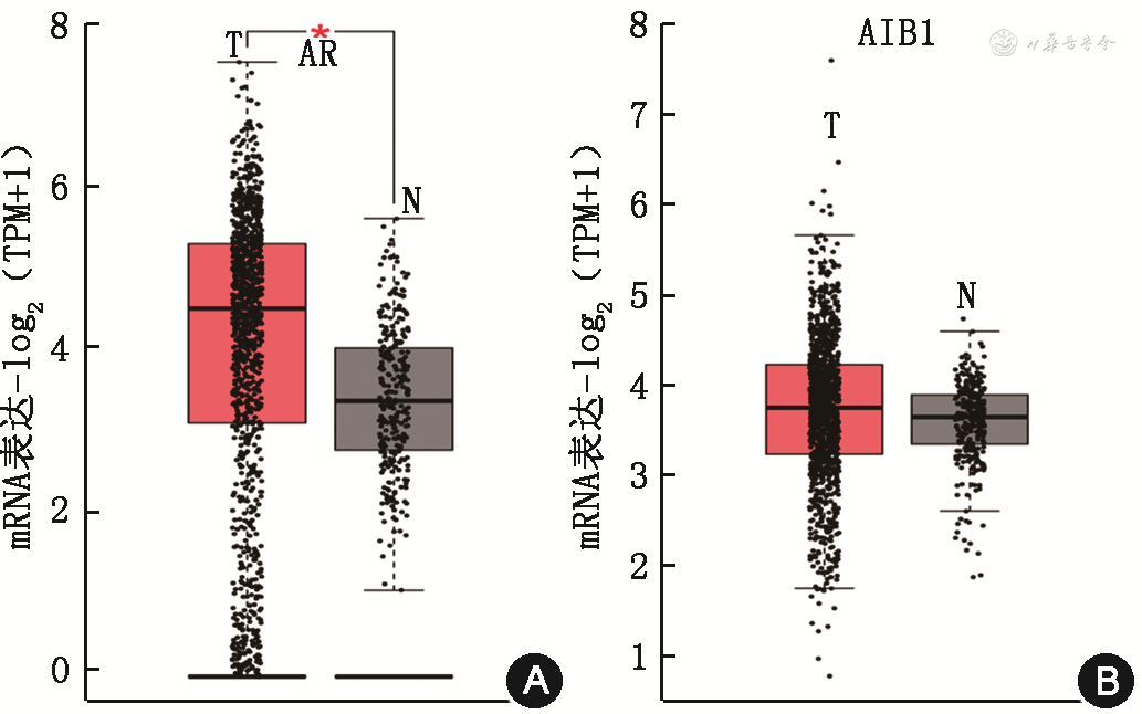 通过GEPIA数据库分析ER阳性乳腺组织中AR及AIB1的mRNA表达水平,结果显示ER阳性乳腺癌组织中AR及AIB1的mRNA表达水平均高于癌旁正常组织(图4)。