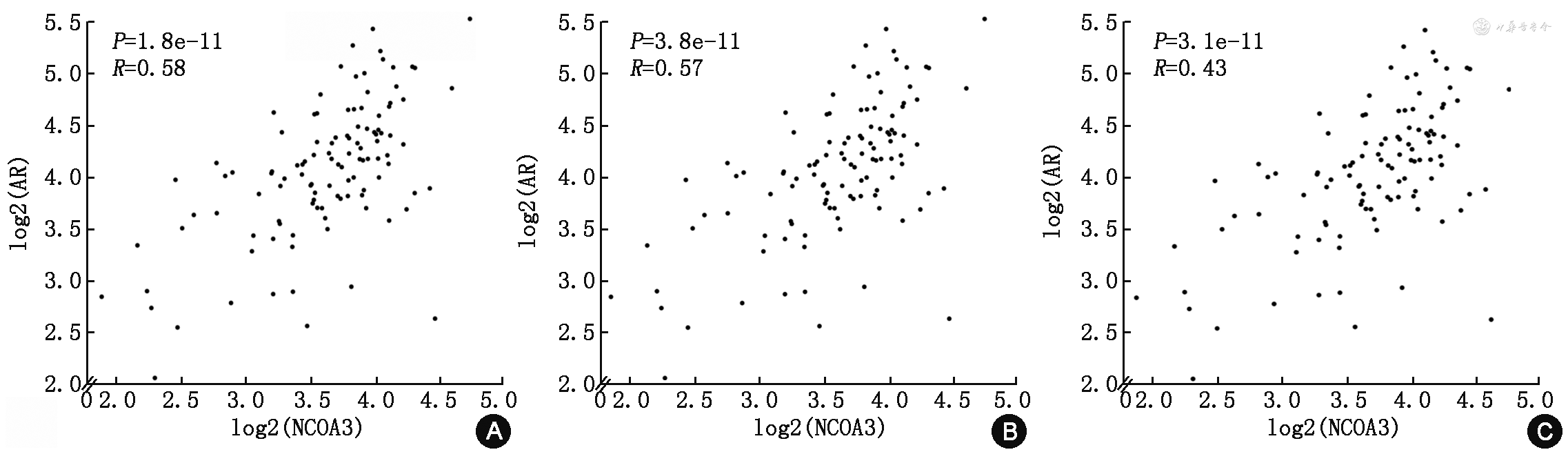 本研究还通过GEPIA数据库对AR及AIB1(NCOA3)表达水平之间的关系进行了分析,发现AR与AIB1(NCOA3)的表达水平呈正相关关系(图6)。