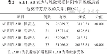 AIB1、AR表达与雌激素受体阳性乳腺癌患者他莫昔芬疗效的关系[例(%)]