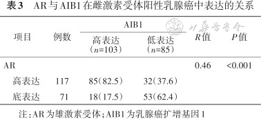 ER阳性乳腺癌中AIB1细胞质表达与AR细胞核表达呈正相关(R=0.46,P<0.001),见表3。