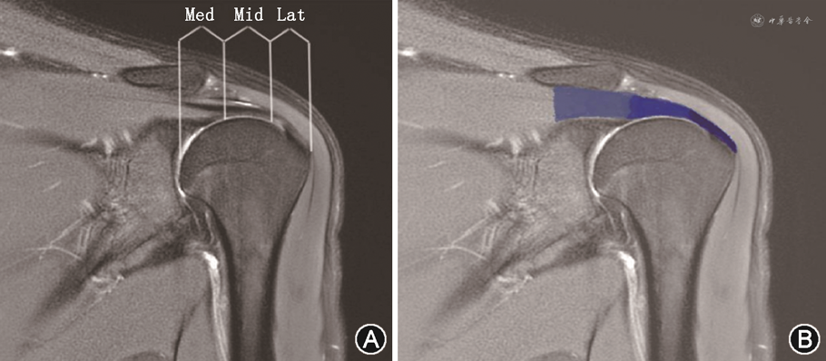 扫描完成后由2名具有10年以上骨肌系统疾病诊断经验的放射科医师独立阅片,使用GE主机定量磁共振图像编译(magnetic resonance image compilation,MAGIC)处理软件包进行图像后处理,生成 T1 mapping、T2 mapping 和 PD mapping 3组定量图谱。参照Ashir等[8]的研究方法,于T2WI斜冠状位图像上以肌肉-肌腱为单元根据肌腱的走形将冈上肌肌腱分为外侧亚区(指冈上肌肌腱纤维远侧插入区域)、中间亚区(指外侧亚区和内侧亚区连线的中点区域)及内侧亚区(指位于外侧亚区内侧方向2 cm左右、高于肱骨头软骨的区域),分别于肌腱的3个亚区勾画感兴趣区(region of interest,ROI),避开脂肪、积液及周围其他组织(图1)。ROI的勾画及测量分别由2名放射科医师(观察者1和2)独立完成,并在间隔至少2 周后重复测量数据,以评估观察者间和观察者内的一致性。最终的分析数据为2名医师4 次测量结果的平均值。