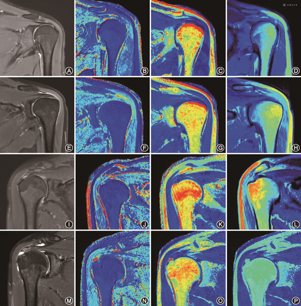肩袖损伤是一种常见病,普通人群中肩袖损伤的患病率为20%~34%,临床上常有颈肩部的夜间疼痛、肩关节无力等症状。冈上肌肌腱是肩袖损伤病理演变过程中最容易累及的区域。常规MRI是目前临床最常用的评估肩袖肌腱损伤病变的影像学手段,但其有一定主观性,缺乏量化标准,不能准确反映肌腱内部结构变化,这限制了对肌腱变性级别和治疗效果的准确评估[1]。集成MRI(synthetic magnetic resonance imaging,SyMRI)序列是一种新型的多模态定量 MRI技术,可以一次生成多组常规加权序列和定量序列,缩短扫描时间,反映人体组织成分的定量化信息,提高临床应用的可行性[2]。目前临床将SyMRI除了应用于中枢神经系统、乳腺及前列腺等方面[3, 4],不少研究证实了其在颞下颌关节、腰椎间盘病变及骶髂关节[5, 6]等骨肌系统成像中的可行性,但目前尚未检索到国内将其应用于肩关节的报道。SyMRI序列可通过调整重复时间(repetition time,TR)及回波时间(echo time,TE)生成不同的图像对比,获得组织的特征性弛豫值(T1、T2、PD值及R1、R2值),实现各种组织早期生化变化如胶原纤维结构、方向和水分含量等方面的定量评估[7]。因此,本研究联合SyMRI序列的定量技术探讨其在冈上肌肌腱损伤分级中的诊断价值,旨在为客观评价肌腱损伤提供新的技术支持。