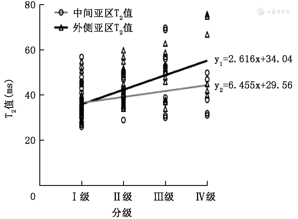 2. T2值比较:外侧及中间亚区的T2值在不同损伤分级中的总体比较差异有统计学意义(均P<0.001),内侧亚区的T2值在冈上肌肌腱损伤不同分级中的总体比较差异无统计学意义(P>0.01)。