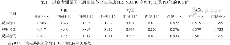 观察者测量冈上肌肌腱各亚区集成MRI MAGIC序列T1、T2及PD值的ICC值