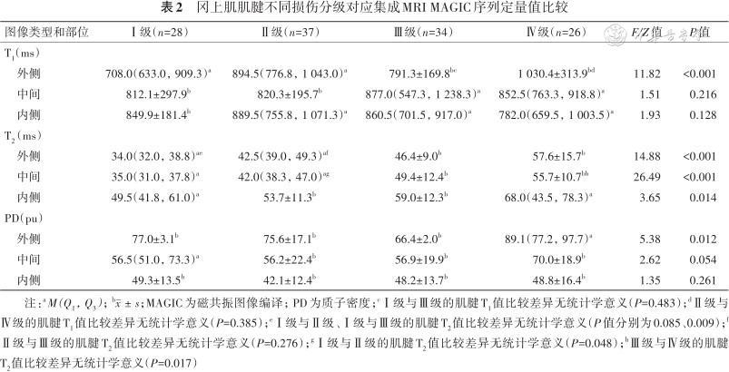 SyMRI技术在冈上肌肌腱损伤程度分级中有很高的临床应用价值,尤其T2值可作为损伤分级的有效量化参数。