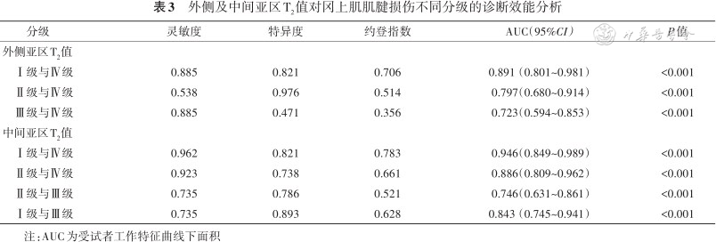 外侧及中间亚区T2值对冈上肌肌腱损伤不同分级的诊断效能分析