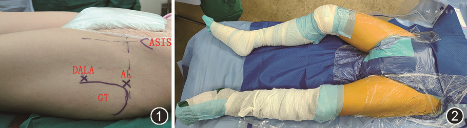 (1)平卧组[7]:术前准备:全身麻醉后,取平卧位,用软垫将骶尾部垫高,充分暴露双侧大转子周围区域,束缚带固定躯干,用棉垫和贴膜包裹会阴部使其与术区分隔开。画出双侧大转子、髂前上棘的轮廓和前外侧入路、远端前外侧辅助入路的位置(图1)。悬吊双下肢后同时对双侧术区消毒、铺单。消毒范围上至脐平面以上5 cm,下至双脚踝。铺单时将无菌单分别包裹双侧下肢至小腿中上段,双下肢均应从洞巾中穿出,确保双髋关节可自由被动活动,以便术中测试松解程度。铺单时应确保双侧髂前上棘、大转子充分显露,铺单完毕后使用无菌透明贴膜覆盖手术区域皮肤(图2)。最后连接关节镜及手术器械。手术操作:向大转子与髂胫束之间的腔隙注射含0.01%肾上腺素的生理盐水50 ml,在前外侧入路与远端前外侧辅助入路点各做一0.5 cm切口,穿刺锥分别通过两切口进入大转子与髂胫束之间的腔隙以建立手术入路。通过两个入路分别置入关节镜、刨刀或射频刀,清理大转子滑囊开拓镜下视野,探查各解剖结构。在大转子外壁中心处,使用射频刀由内向外(由大转子侧向皮下脂肪组织侧)横向离断髂胫束(图3)。松解完毕后检查交腿试验、被动屈髋内收内旋活动。若交腿试验阴性、被动屈髋内收内旋活动无受限和弹响,则说明松解完全,手术结束;若上述体征未完全缓解,沿大转子后缘由内向外、由远端向近端松解臀大肌止点处腱性组织,直至体征完全缓解。一侧手术结束后即刻行对侧手术,方法同前。术后处理:缝合手术切口后包扎,撤除手术器械与无菌单。