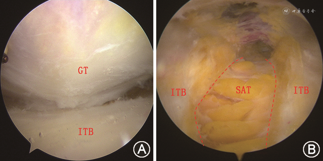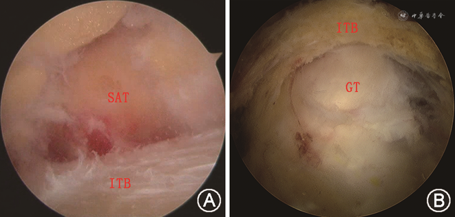 关节镜手术治疗GMC已有二十余年历史,通过不断完善、改进手术方案,手术技术逐渐成熟,取得了满意的疗效[9, 10, 11]。2003年,刘玉杰等[12]发表了关节镜手术治疗GMC的初步报告。该手术方案采用侧卧位,双侧分次进行消毒、铺单,钝性分离臀肌挛缩带表面的皮下脂肪组织,并进行部分清理,制造出关节镜手术的操作腔隙,随后使用射频刀由浅入深逐层松解臀肌挛缩带。然而,臀肌挛缩带周围肌肉组织丰厚,血管分布多,坐骨神经、臀上及臀下神经、皮神经走行于附近,广泛松解臀肌挛缩带增加了术后臀大肌无力的风险,并且周围血管与神经损伤风险高[13, 14, 15]。为此,唐翔宇等[5]提出了关节镜下大转子周围C形松解术治疗GMC,将松解部位由臀肌挛缩带转移至大转子周围的髂胫束等腱性组织。由于大转子周围的腱性组织是阔筋膜张肌和臀大肌肌腱汇成髂胫束的移行部,且肌肉组织和血管神经分布少,松解该区域不仅能有效降低挛缩带的张力,还可显著减少肌肉组织、血管及神经损伤的风险,手术效果良好,已在临床中得到广泛认可与应用[16, 17, 18]。