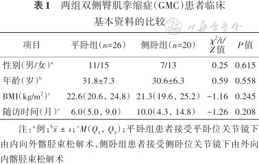 注:a例;b; cM(Q1,Q3);平卧组患者接受平卧位关节镜下由内向外髂胫束松解术,侧卧组患者接受侧卧位关节镜下由外向内髂胫束松解术