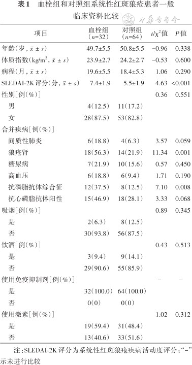 本研究为病例对照研究,研究方案经聊城市人民医院伦理委员会审查同意[文件号:伦研(2018)第07号]。回顾性选取聊城市人民医院2018年6月至2021年6月收治的发生下肢深静脉血栓的SLE患者32例作为血栓组,选取同期收治的未发生下肢深静脉血栓的SLE患者64例作为对照组。纳入标准:(1)符合美国风湿病学会(American College of Rheumatology,ACR)制定的诊断标准[12]:具有颊部红斑、盘状红斑、光过敏、口腔溃疡、关节炎等临床表现,患者均处于疾病活动期;(2)年龄19~75岁;(3)下肢深静脉血栓的诊断依据下肢血管超声,超声检查发现下肢血管管腔内为低回声或无回声,可探及少量血流信号,或无血流信号。排除标准:(1)癌症患者;(2)患者存在其他类型的自身免疫性疾病(皮肌炎、炎性肠病、类风湿性关节炎等);(3)人类免疫缺陷病毒(human immunodeficiency virus,HIV)感染患者;(4)合并血液系统疾病(如白血病、血友病、凝血因子缺乏症等);(5)伴有其他系统的重大疾病:急性脑梗死、脑出血、心肌梗死等。
