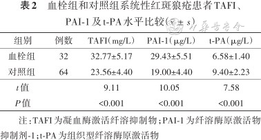 血栓组SLE患者血浆TAFI、PAI-1水平增高,t-PA水平降低,并且是SLE患者并发下肢深静脉血栓形成的相关因素。