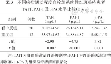 血栓组患者的TAFI、PAI-1水平高于对照组,t-PA水平低于对照组(均P<0.05);结果见表2。根据SLEDAI-2K评分标准,血栓组32例患者中,轻度活动患者4例、中度活动患者16例、重度活动患者12例。轻中度组患者TAFI、PAI-1水平低于重度组,t-PA水平高于重度组(均P<0.05);结果见表3。