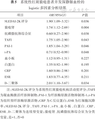 综上所述,血栓组SLE患者的TAFI、PAI-1水平增高,t-PA水平降低,并且是SLE患者并发下肢深静脉血栓的相关因素。