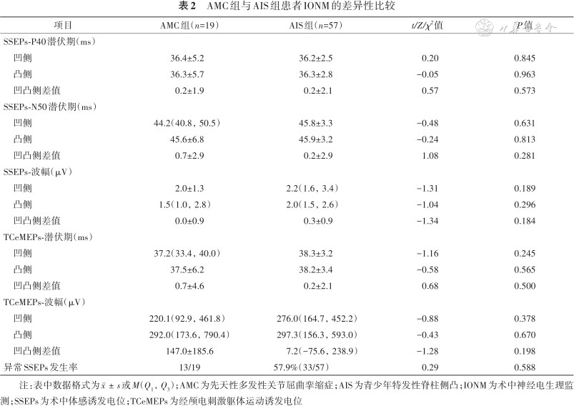 注:表中数据格式为或M(Q1,Q3);AMC为先天性多发性关节屈曲挛缩症;AIS为青少年特发性脊柱侧凸;IONM为术中神经电生理监测;SSEPs为术中体感诱发电位;TCeMEPs为经颅电刺激躯体运动诱发电位