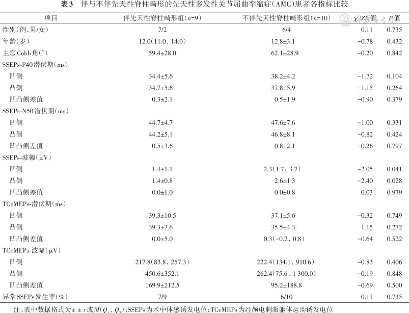 AMC患者中伴先天性脊柱畸形者9例,包括分节不良7例、分节不良伴半椎体畸形1例(L5半椎体畸形)、分节不良伴蝴蝶椎畸形1例(T9蝴蝶椎、T3~10分节不良)。SSEPs-波幅在伴先天性脊柱畸形AMC患者的凹侧为(1.4±1.1)μV,在不伴先天性脊柱畸形AMC患者的凹侧为(2.6±1.2)μV,在伴先天性脊柱畸形AMC患者的凸侧为(1.4±0.8)μV,在不伴先天性脊柱畸形AMC患者的凸侧为(2.6±1.3)μV,两组间差异均有统计学意义(均P<0.05)。伴先天性脊柱畸形AMC患者中凹凸侧间TCeMEPs-波幅差值为(169.9±212.5)μV,在不伴先天性脊柱畸形AMC患者中为(95.2±188.8)μV,差异无统计学意义(P=0.500)。另外,伴先天性脊柱畸形组共7例(7/9)患者有异常SSEPs,不伴先天性脊柱畸形组共6例(6/10)患者有异常SSEPs,两组间差异无统计学意义(P=0.735)。结果详见表3。