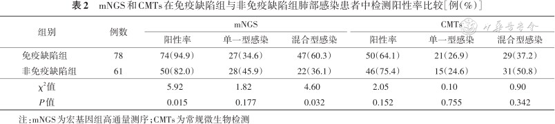 mNGS和CMTs在免疫缺陷组与非免疫缺陷组肺部感染患者中检测阳性率比较[例(%)]