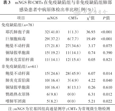 mNGS和CMTs在免疫缺陷组与非免疫缺陷组肺部感染患者中病原体检出率比较[例(%)]