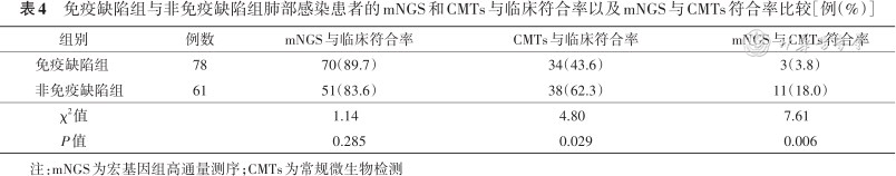 免疫缺陷组与非免疫缺陷组肺部感染患者的mNGS和CMTs与临床符合率以及mNGS与CMTs符合率比较[例(%)]