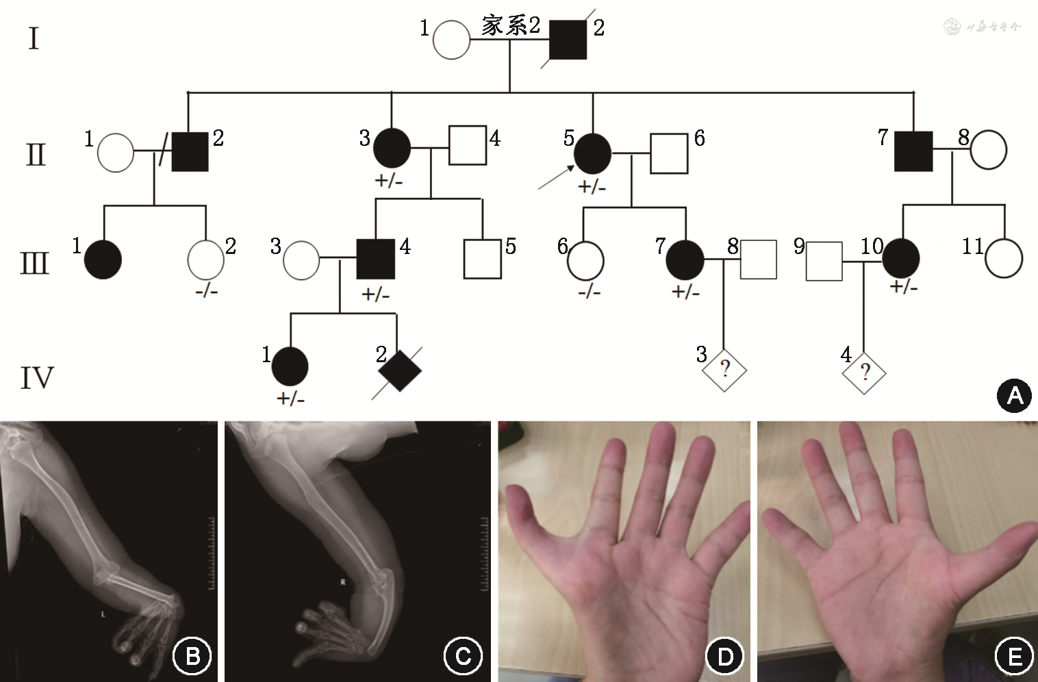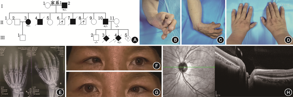2.家系2(图2A):先证者(Ⅱ:5),女,48岁,因双侧上肢畸形姿势异常而就诊,X射线显示双侧前臂短小屈曲桡骨缺如,双手拇指缺如,余指屈曲(图2B、2C)。家系中其他患者骨骼畸形症状相对较轻,患者(Ⅲ:7)为多指且手术矫正后,其余患者的双手存在鱼际发育不良(图2D、2E)。受累胎儿(Ⅳ:2)在孕18周超声影像结果:头颅、脊柱、四肢均显示正常,右手大拇指呈背曲状态;右肾区未检测到肾脏回声,在盆腔内膀胱后方可见疑似肾脏样回声,大小约14 mm×8 mm,提示胎儿疑似存在盆腔异位肾。该胎儿在孕22周超声复查,右手大拇指呈背曲状态,盆腔内膀胱后可见大小约22 mm×13 mm的疑似肾脏样回声,同时超声心动图显示胎儿心内结果正常。