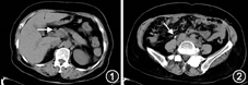 进一步完善相关检查:抗溶血性链球菌素O 27.6 IU/ml;补体C3 0.647 g/L(参考值:0.73~1.46 g/L),补体C4 0.217 g/L;ANA、抗ENA抗体、ANCA、抗GBM抗体均阴性;IgG 17.13 g/L(参考值:7.00~17.00 g/L),IgA 1.14 g/L,IgM 0.50 g/L;总IgE 187 kU/L(参考值:0~60 kU/L);血清蛋白电泳、血免疫固定电泳未见单克隆蛋白。胸腹盆CT:部分纵隔淋巴结稍肿大;胰头饱满,胆总管增宽;左肾增大,双肾积水(轻中度);双侧髂动脉、输尿管盆段周围软组织密度影,腹膜后纤维化不除外(图1、图2)。磁共振尿路成像MRU:双侧尿路梗阻,肾盂输尿管积水,梗阻位于小骨盆入口处第二狭窄,右肾形态及信号异常(凹凸不平,体积缩小,肾实质变薄,皮髓质分界不清)。