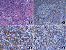 进一步完善检查:PPD、尿抗酸染色阴性;肿瘤标记物细胞白蛋白19片段(Cyfra21–1) 4.11 ng/ml(参考值:0~3.5 ng/ml),余均在正常范围;血清IgG亚型:IgG1 8 830 mg/L,IgG2 2 620 mg/L,IgG3 172 mg/L,IgG4 14 100 mg/L(参考值:80~1 400 mg/L)。腮腺活检:涎腺组织显慢性炎症,伴纤维组织及多量淋巴细胞、浆细胞浸润,免疫组化:CD138、CD38、IgG、IgG4阳性(图3, 图4, 图5, 图6)。