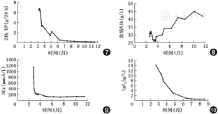 IgG4相关疾病的治疗首选激素。2月26日加用泼尼松65 mg 1次/d(1 mg/kg),2月27日双侧腮腺即出现缩小,尿量明显增至2 000 ml/d。尿常规:蛋白1g/L,潜血80红细胞/μl,异形红细胞比20%;24 h尿蛋白6.5g/24 h;尿蛋白电泳:肾小球来源100%;尿β2–微球蛋白21.8 mg/L,尿氨基葡萄糖肌酐比(U–NAG/Cr)3.68 U/mmol。血磷脂酶A2受体阴性。血IgG4、血肌酐、24h尿蛋白和白蛋白的变化见图7,图8,图9,图10。