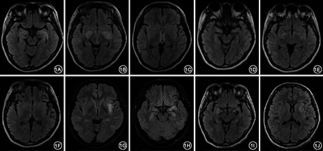 6周前患者近记忆力下降,重复问同一问题,交流减少,易发脾气,间断右上肢摸索动作。遂以"脑病待查,视神经脊髓炎谱系病?"收入院。入院体检:神志清楚,言语流利;时间、地点定向力差,人物定向力可,远记忆力可,近记忆力及短时记忆力差,计算力、理解力正常;颅神经检查未见明显异常,感觉对称正常,四肢肌力Ⅴ级,肌张力对称适中,双侧指鼻试验、跟膝胫试验稳准,四肢腱反射对称引出,双侧病理反射均阴性,脑膜刺激征阴性。
