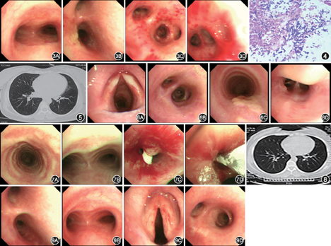 1995年Denning[3]首先提出"曲霉菌气管–支气管炎"的概念,并将其分为3种类型:阻塞型、假膜型和溃疡型。此后陆续又有病例报道,但命名杂乱,如伪膜/阻塞性曲霉性气管支气管炎、气管支气管曲霉病、伪膜坏死性支气管曲霉病等[4,5],一方面显示出此类疾病表现多样,另一方面也反映出目前对气道侵袭性曲霉病的定义与分类尚不明确。Wu等[6]对19例侵袭性气管曲霉病患者的临床表现、胸部影像学、气管镜下表现以及治疗转归进行了回顾性分析,提出了孤立性侵袭性气管曲霉病的概念,对气道侵袭性气管曲霉病的气管镜下表现进行了系统分类:浅表浸润型、全层受累型、阻塞型、混合型。并指出气道内介入结合全身和局部药物治疗可达到较好的效果。