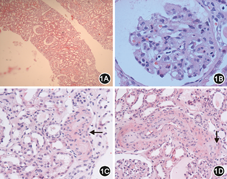 诊治经过:血常规:WBC 10.01×109/L,Hb 105 g/L,血小板计数127×109/L;网织红细胞2.56%(升高);血涂片可见少量红细胞碎片;尿常规+沉渣:蛋白1.0 g/L,潜血25个细胞/μl,红细胞18.9个/μl,异型红细胞95%;24 h尿蛋白3.13 g;生化:TBil 19.4 μmol/L,DBil 6.4 μmol/L,K 3.4 mmol/L,Cr 479 μmol/L,Urea 16.04 mmol/L,LDH 524 U/L;ESR、超敏C反应蛋白(hsCRP)正常;补体:C3 0.719 g/L(下降),C4 0.719 g/L;抗链球菌溶血素O(ASO)、巨细胞病毒(CMV)DNA、EB病毒(EBV)DNA、肾综合征出血热IgM(–);抗核抗体(ANA)、抗磷脂抗体、ANCA、GBM抗体 (–);血、尿免疫固定电泳(–);送检北京大学人民医院:血管性血友病因子裂解酶自身抗体(ADAMTS–13)528 μg/L(正常值481~785 μg/L);北京大学第一医院:H因子241.8 mg/L(正常值277~1 018 mg/L),I因子54 mg/L(均值为35 mg/L),H因子抗体(–)。双肾超声检查:双肾弥漫性病变。肾穿刺活检病理:免疫荧光(–);光镜:全片可见25个肾小球,1个球性硬化,2个节段性硬化。肾小球细胞数轻度增加,可见节段性系膜细胞增生和基质增多。部分毛细血管襻受压变窄。大部分肾小球GBM变性、皱缩,伴包曼囊腔扩张,GBM内疏松层节段性增宽,呈"双轨样"改变,可见中性粒细胞浸润。肾小管上皮细胞可见空泡变性及刷状缘脱落。管腔内可见蛋白管型。可见多处灶性的肾小管基底膜(TBM)增厚和肾小球萎缩。间质内可见多处灶性的水肿与轻度纤维化,伴有少量单个核细胞为主的炎性细胞浸润。肾内小血管管壁普遍性增厚、弹力纤维增生、管腔狭窄,部分管腔闭塞,内皮细胞增生、肿胀,内皮水肿、黏液变性及红细胞碎片沉积。光镜诊断:符合血栓性微血管病(图1)。