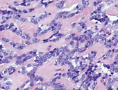 入院诊断:女性继发性闭经、高雄激素血症、右侧卵巢肿瘤。2012年8月8日行"腹腔镜下探查术",术中探查盆腔右侧卵巢囊实性增大,约5 cm×5 cm×4 cm,表面光滑,有明显包膜,活动度较好,与周围无粘连。切开右侧卵巢囊肿囊壁,见囊内组织呈囊实变,实变区组织较脆,术中快速冰冻病理为右侧卵巢恶性肿瘤,倾向生殖源型(图1)。考虑患者将来有生育要求,行右侧(单侧)附件切除,氟尿嘧啶植入宫内。冰冻送检组织行免疫组化:AE1/AE3(+),AFP(-),a-Inhibin(+),Calretinin(+),CD30(-),CD99(+),Cdx-2(-),CEA(-),CK7(-),ER(+),p53(+),PR(+);病理诊断:结合组织学形态及免疫组化标记,符合性索间质肿瘤,倾向中分化Sertoli-Leydig细胞瘤。2012年8月9日(术后第2天)复查血清睾酮0.62 nmol/L,17α羟孕酮1.45 nmol/L。2012年9月20日月经来潮。患者于2012年9月至2013年1月以顺铂、依托泊苷、博来霉素分别进行5次化疗。随访2年余,月经周期规律,经量略少,复查血清睾酮在0.03~0.94 nmol/L之间波动,妇科超声检查未见肿瘤复发。