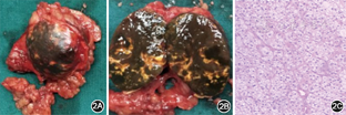 患者女,32岁。因"血压升高8个月余,血糖升高5个月余,产后11周"于2016年3月16日入院。患者孕前无心脏病、高血压、糖尿病病史,否认糖皮质激素服用史,近3年体重增加约15 kg。平素月经规律,孕前末次月经为2015年4月18日,自然受孕,孕期外院定期产检。8个月余前(孕12+周)测血压160/100 mmHg(1 mmHg=0.133 kPa),口服拉贝洛尔(100 mg,3次/d)降压,血压控制在140/100 mmHg左右。5个月余前(孕25+周)测血压176/120 mmHg,口服葡萄糖耐量试验(OGTT)示空腹、1 h、2 h血糖分别为5.59、13.45、8.71 mmol/L(妊娠期糖尿病OGTT诊断标准:空腹、1 h、2 h分别大于7.0、10.0、8.5 mmol/L);心脏彩色超声显示左心房左心室扩大,左心室射血分数42.2%;皮质醇升高且节律消失,促肾上腺皮质激素(ACTH)正常低限(表1);24h尿游离皮质醇319.15 μg/L(正常值20~80 μg/L);彩色超声示右侧肾上腺占位(约2.7 cm×2.5 cm);考虑"皮质醇增多症,腺瘤可能性大",予拉贝洛尔(3次/d)和硝苯地平控释片(拜新同,2次/d)降压、胰岛素降糖等治疗,血压控制140/90 mmHg左右,血糖控制在3.5~7.5 mmol/L。孕32+周时出现腹壁、左侧大腿内侧长条形紫纹,宽度不足1 cm。孕34+周(2015年12月24日)经剖宫产分娩1早产女活婴,体重2 480 g,身长46 cm,Apgar评分为10分,体重稳步增长。分娩后乳汁正常分泌,月经恢复;停用降糖药,血糖波动在6~10 mmol/L;监测血压,逐步调整为硝苯地平控释片30 mg(每天1~2次)降压,血压控制在140/100 mmHg左右,为进一步明确肾上腺占位性质入院。体检:心率112次/min,呼吸20次/min,血压142/90 mmHg。无多毛、痤疮、满月脸、水牛背、多血质等。心、肺检查未见异常。腹壁、左侧大腿内侧散在分布长条形紫纹,宽度小于1 cm,四肢肌力正常。入院后检查:血白细胞6.0×109/L;嗜酸性粒细胞0;尿蛋白2+;血钾4.18 mmol/L,血钠136.6 mmol/L;OGTT空腹、2 h分别为5.71、6.99 mmol/L(糖尿病诊断标准为空腹、2 h分别大于7.0、11.1 mmol/L);皮质醇水平正常但节律消失,ACTH正常低限(表1);1 mg过夜及大剂量地塞米松抑制试验均不被抑制;肾上腺增强CT示右侧肾上腺占位,双侧正常肾上腺组织萎缩(图1);心脏彩色超声示左心房左心室扩大,左心室射血分数46.8%;血及尿儿茶酚胺、肾素-血管-紧张素醛固酮正常,垂体MRI正常。诊断为"皮质醇增多症",于2016年4月20日行右侧肾上腺肿物切除术,病理符合肾上腺皮质腺瘤(图2)。术后随访3个月,停用降压药后血压波动在120~140/80~90 mmHg,皮质醇水平恢复正常(表1)。