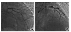 患者男,63岁。因"突发胸痛2 h"入院。患者晨起活动时突发剑突下压榨性疼痛,持续不缓解,伴全身大汗淋漓,无其他部位放射痛,无头痛、晕厥,无咳嗽、咯血,无恶心、呕吐,无呼吸困难。既往有高血压病史10余年,糖尿病病史3年。入院体检:体温36.5℃,脉搏63次/min,呼吸17次/min,血压118/76 mmHg(1 mmHg=0.133 kPa)。神志清,精神稍萎靡,痛苦面容,心肺腹体检未见明显异常。急诊查心电图示:窦性心律;V1~V4导联R波递增不足;V5、V6导联ST段上斜型压低伴有J点下移;V2~V4导联T波高尖;aVR导联ST段稍抬高(图1);肌钙蛋白I<0.10 μg/L、肌酸激酶同工酶<2.00 μg/L、肌红蛋白<20.00 μg/L;D-二聚体0.16 mg/L;N末端B型利钠肽前体4 560 ng/L。考虑de Winter综合征,拟诊"急性冠状动脉综合征(ACS)"收入冠心病重症监护室(CCU),予阿司匹林300 mg、替格瑞洛180 mg口服后行冠状动脉造影(CAG)示:开口正常,左冠状动脉主干(LM)未见明显狭窄;左冠状动脉前降支(LAD)近段闭塞,前向血流心肌梗死溶栓治疗(TIMI)0级(图2A);左回旋支(LCX)正常,前向血流TIMI 3级;右冠状动脉(RCA)中段斑块,前向血流TIMI 3级;于LAD病变处行经皮冠状动脉介入(PCI)治疗,置入支架一枚,术后LAD血流恢复,前向TIMI 3级(图2B)。术后约2h复查心电图提示:窦性心律,V4~V6导联下压的ST段恢复至基线附近,V2~V5导联高尖T波变低,aVR导联ST段也恢复至正常水平(图3)。