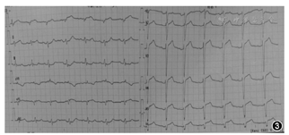 de Winter综合征鉴别诊断:de Winter综合征ST段上斜型压低伴ST-T改变应与心率加快时ST段下斜型压低进行鉴别。心率增快常出现ST段下斜型压低,此时并非存在心肌缺血,通常认为与心房复极有关。在心电图上区分两者的最重要方法是de Winter综合征ST-T上斜型压低不会随心率的快慢变动而发生改变,而心率加快导致的ST-T下斜型压低常伴随窦性心动过速,且不是固定不变的,可随着心率的变化而变化。本例患者心率仅为63次/min,心率偏缓,更加支持de Winter综合征的诊断。