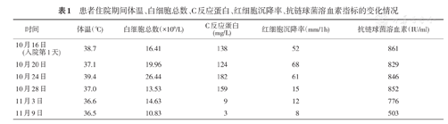 患者住院期间体温、白细胞总数、C反应蛋白、红细胞沉降率、抗链球菌溶血素指标的变化情况