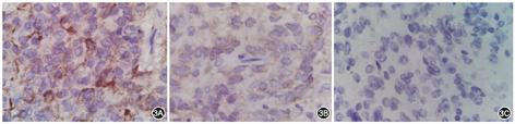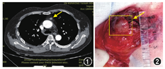 入院后检查血钾水平均低于正常,骨密度检查提示骨质疏松;动脉血气分析提示碱中毒;血儿茶酚胺检测均在正常范围内;尿17-羟皮质类固醇(17-OHCS)、尿17-酮皮质类固醇(17-KS)明显升高,动态皮质醇检测提示节律消失且均高于正常上限(表1)。甲状腺功能正常。大小剂量地塞米松抑制试验,皮质醇均不能被抑制(表2)。且大剂量地塞米松抑制试验中皮质醇和ACTH出现逆向升高。影像学检查:甲状腺B超未见占位性病变。鞍区磁共振成像(MRI)未见明显异常。肾上腺及肾动脉CT提示双侧肾上腺结节样增粗,双侧肾动脉未见狭窄。胸、腹、盆CT扫描,发现胸腺区结节状软组织密度影,直径约0.8 cm(图1)。由此考虑该患者可能是位于纵隔的胸腺瘤异位分泌ACTH。患者在胸腔镜下行前纵隔肿物切除术,瘤体为一个坚固的、边界清楚的8 mm×8 mm×8 mm结节,无包膜(图2)。术后病理及免疫组化结果:副神经节瘤,ACTH(+),NSE(+),CgA(++),S-100(+),SYN(+),Ki67(+,<1%)(图3)。由此最终确诊为异位分泌ACTH的纵隔副神经节瘤。