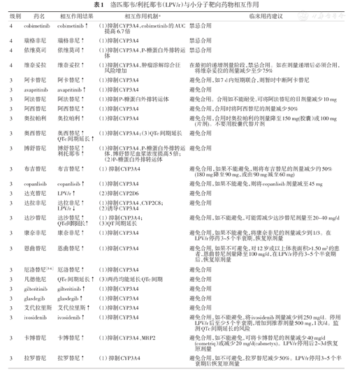 | 3 | 曲贝替定 | 曲贝替定↑ | (1)抑制CYP3A4 | 避免合用,如必须短期合用(如少于14d),在曲贝替定给药后1周使用LPV/r,并在下一次LPV/r给药前一天停LPV/r |