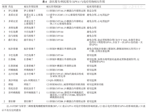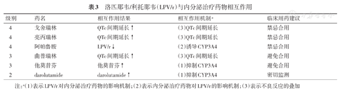 | 3 | 尼洛替尼 | 尼洛替尼↑(LPV/r↑ | 1)抑制CYP3A4;(2)抑制CYP3A4、P-糖蛋白外排转运体 | 避免合用 |