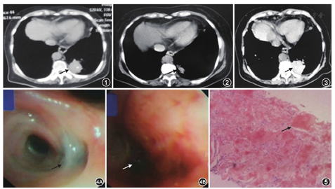 患者女,71岁。2018年10月2日无明显诱因出现咯血,鲜红色,总量约1 000 ml,伴呼吸困难,无胸痛、恶心、呕吐等症状,未予特殊处理。10月3日出现发热,体温最高达38 ℃,就诊于当地医院,查红细胞3.35×1012/L,血红蛋白102 g/L,血小板计数128×109/L;凝血酶原时间15.2 s,凝血酶原时间百分比64.2%。咯血原因待查,肺炎?肺癌?肺结核?支气管扩张?给予止血、消炎等对症治疗(具体不详),仍有间断咯血,为明确诊断,遂于10月4日就诊于我院急诊科。查血红细胞2.42×1012/L,血红蛋白76 g/L,血小板计数80×109/L;白蛋白28.6 g/L,钾3.19 mmol/L;凝血酶原时间19.9 s,凝血酶原活动度51%,D-二聚体652 μg/L;降钙素原0.84 μg/L;血气分析:动脉血氧分压77 mmHg(1 mmHg=0.133 kPa),动脉血二氧化碳分压33.1 mmHg。胸部CT平扫+增强示,左肺下叶支气管闭塞,远端各叶分支未见明确显示,左肺下叶后外基底段片状高密度影,其内类圆形低强化区,占位性病变不除外(图1)。为评估支气管动脉及其肺部病变,行支气管动脉血管成像(CTA)示,约第7胸椎水平降主动脉内侧壁发出一支血管,其分出一支肋间动脉,另一支走行至右肺门。咯血原因待查,肺炎?肺癌?肺结核?给予垂体后叶注射液(3 ml,静脉点滴或静脉泵入,共5次)、酚磺乙胺(15 ml,1次/d,静脉点滴,共4 d)、矛头蝮蛇血凝酶(2单位,2次/d,静脉注射,共4 d)止血、头孢哌酮-他唑巴坦(2.25 g/次,2次/d,静脉点滴,共4 d)抗感染、泮托拉唑纳(40 mg,1次/d,静脉点滴,共4 d)抑酸、氯化钾补钾对症治疗,咯血量逐渐减少,间断咯暗红色血块。10月7日再次突发咯血,量约500 ml,因内科治疗效果欠佳,给予左、右支气管动脉造影,左支气管未见显影,右支气管动脉增粗显影,逐个造影,选择至责任动脉,注入适量明胶海绵颗粒栓塞,栓塞后再次造影时栓塞满意,后咯血症状明显改善,为进一步明确诊断,于10月8日收入我院呼吸科。既往史:干燥综合征15余年,未治疗。入院体检:体温36.2℃,脉搏80次/min,呼吸19次/min,血压141/61 mmHg。神清语利,浅表淋巴结未触及,唇红,双肺呼吸音粗,左下肺可闻及湿啰音。心率80次/min,律齐,心脏各瓣膜听诊区未闻及病理性杂音。腹软,无压痛及反跳痛,肝脾肋下未及,双下肢无水肿。辅助检查:2018年7月6日因干燥综合征行胸部CT示,双肺间质性改变,双肺散在肺大泡;左肺下叶后基底段不规则团片状影伴钙化影,陈旧病灶可能(图2)。初步诊断:(1)咯血原因待查,肺炎?阻塞性肺炎?肺癌?肺结核?(2)干燥综合征。入院后给予酚磺乙胺(2 g,1次/d,静脉点滴,共8 d)止血、头孢哌酮-他唑巴坦(2 g,2次/d,静脉点滴,共22 d)、左氧氟沙星(0.4 g,1次/d,静脉点滴,共18 d)抗感染,氯化钾补钾治疗。治疗后患者无咯血,病情平稳。入院后完善实验室检查,结核分枝杆菌核酸检测阴性;结核抗体阴性;结核分枝杆菌抗原分析CFP10(-),LAM(-),ESAT(-),38 000(+),16 000(-);结核分枝杆菌T细胞检测阴性。癌胚抗原1.63 μg/L,癌抗原125(CA125)31.42 U/ml,癌抗原15-3(CA15-3)7.69 U/ml,甲胎蛋白4.41 μg/L,人绒毛膜促性腺激素0.96 mIU/ml,鳞癌抗原0.78 μg/L,神经元特异性烯醇化酶4.04 μg/L,细胞角蛋白19片段4.73 μg/L,糖链抗原19-9(CA19-9)17.86 U/ml,糖链抗原242(CA242)5.39 U/ml,结合型前列腺特异性抗原(C-PSA)0.52 μg/L,糖链抗原72-4(CA72-4)1.44 U/ml。红细胞沉降率90 mm/1h;IgA 6.53 g/L,IgG 28.31 g/L,轻链κ(KAPPA)5.48 g/L,轻链λ(LAMBDA)4.55 g/L;抗核抗体(+),抗SSA/Ro 60 000抗体(+),抗SSA/Ro 52 000(+);补体C4 0.12 g/L。为明确咯血病因,10月15日行正电子发射计算机断层显像(PET-CT)示,(1)左肺下叶后基底段空洞型肿块,临近少量胸腔积液,倾向空洞型肺结核可能。(2)左肺上舌段混合密度结节(图3)。因不能排除继发性肺结核可能,10月17日行气管镜检查示,左上叶后段支气管黏膜可见少许污秽色色素沉着,开口可见一腺体萎缩。左下叶后基底段一亚支内可见新鲜出血,吸引干净后远端可见一暗红色血块完全阻塞。余未见明显异常(图4)。因气管镜检查中未见肿瘤征象,未能取得活检,为进一步明确病灶性质,于10月22日行肺穿刺活检,左下肺活检组织病理显示,肺组织结构消失,大量炎性细胞浸润,大量均质红染无结构物质沉积,高度可疑淀粉样物质沉积。因我院病理科无法行刚果红染色,遂送至外院病理科,刚果红染色显示左下肺组织间质内见团块状粉染无定形物沉积,结合形态及特殊染色结果,符合淀粉样物质沉积(图5)。免疫组化,CD68(散在+细胞),Masson(±),刚果红染色(+),PAS(+)。因患者既往干燥综合征15余年,肺穿刺活检提示肺淀粉样变,故诊断干燥综合征继发支气管肺淀粉样变伴咯血。经支气管动脉栓塞术、抗感染、止血对症治疗后,患者目前无咯血症状,建议至风湿免疫科进一步诊治。