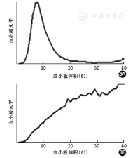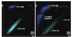 全自动血液分析仪主要通过两种通道检测血小板,分别为电阻抗法和荧光染色法检测通道。首先仪器采用电阻抗法检测血小板数值。此方法依据电阻抗原理,细胞的体积与电阻值呈正比,红细胞和血小板因体积不同会产生不同的电阻信号。红细胞体积大、数量多,在直方图上右侧80~100 fl处呈现较大的峰。而血小板体积小,在直方图左侧8~13 fl呈现较小的峰。正常情况下,两峰不会相互干扰,但是当标本中有大血小板、聚集血小板、小红细胞、红细胞碎片等情况下,血小板和红细胞的两峰就会相互干扰,导致峰形态异常、计数不准确。在这种情况下,采用荧光染色法通道计数血小板可避免检测误差。该方法通过流式细胞学方法,通过前向角散射光(FSC)和侧向荧光(SFL)区分红细胞和血小板。血小板体积较红细胞小,故前向角散射光强度较红细胞弱,分布在散点图下方。成熟的红细胞内无核酸,而血小板内存在少量的线粒体核酸,故侧向荧光强度较红细胞大,分布在散点图横坐标的右侧。该方法可区分小红细胞、红细胞碎片和血小板,准确计数血小板数值。正常人荧光染色法检测血小板散点图及电阻抗法检测血小板直方图如图2A和图3A所示。该患者诊断为骨髓纤维化,外周血涂片提示存在小红细胞、红细胞碎片、泪滴样红细胞、大血小板(图1)。小红细胞及红细胞碎片大小近似于血小板,电阻抗法将其误判为血小板,导致血小板计数假性升高。通过荧光染色通道,检出血小板实际数量为36×109/L。该患者荧光染色法检测血小板散点图及电阻抗法检测血小板直方图如图2B和图3B所示。