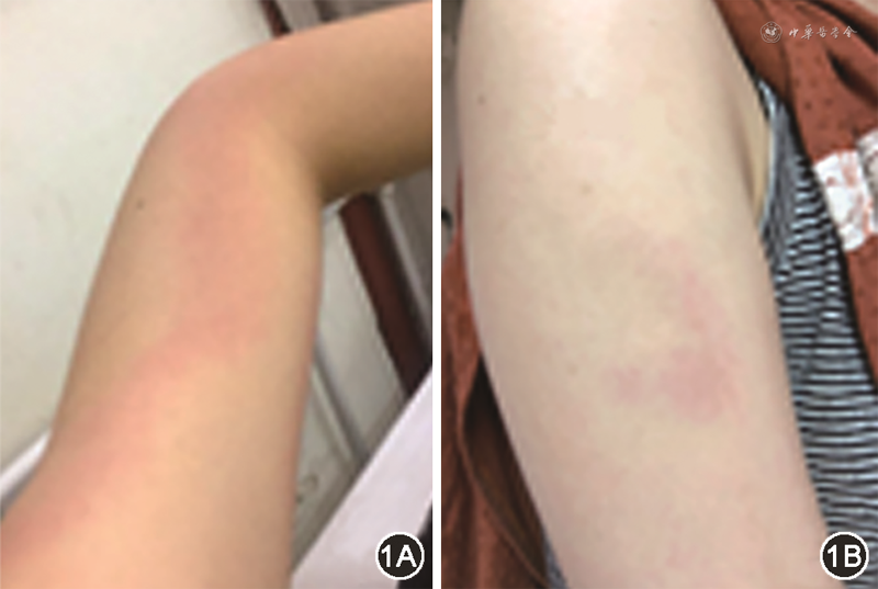 | 2019年11月 | 右上臂单个游走性红斑,左大腿内侧数个结节性红斑样皮损,伴发热 | 血常规、CRP、PCT、免疫球蛋白与补体均正常,ANA、抗Sm抗体、抗dsDNA抗体、ANCA、抗磷脂抗体等阴性;HBV、HCV、HIV、梅毒、CMV、EBV等抗体及结核T-SPOT等均阴性;心电图、心脏超声、双侧膝关节平片均未见异常;脑脊液常规、生化及病原体二代测序(mNGS)未见异常 | 阿莫西林静脉点滴1g/次,1次/6h;米诺环素口服100 mg/次,2次/d治疗4周,发热、皮损无改善;得宝松1 ml 肌肉注射1次,体温随即复常,数日后右上臂及左大腿皮损消退 |