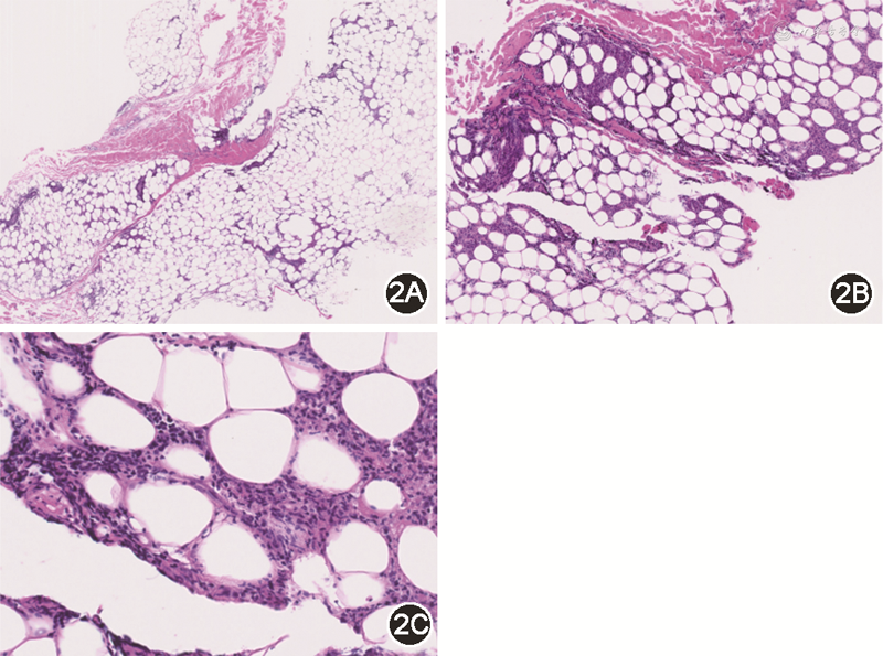 患者女,25岁,辽宁籍。因“反复游走性红斑1年余,结节性红斑样皮损10个月”于2020年3月26日就诊我院。2019年1月6—13日患者至捷克等地出差,出差过程中未去过野外灌木林,否认蜱虫叮咬及外伤史。2019年2月5日患者左上臂外侧出现硬币大小红斑,质硬,伴肿胀、压痛,随后红斑范围扩大(图1A),并出现左侧腋窝淋巴结肿痛,无发热、关节痛等其他不适。2019年4月22日患者于牡丹江林业中心医院查Lyme-IgG阳性,诊断“莱姆病”,主要诊治经过见表1。2019年8、9、10月在当地疾病控制中心查血清莱姆病抗体均阳性(表2)。2020年3月26日患者来我院就诊时右上臂伸侧可见一弓形红斑(图1B),局部压痛,无其他阳性体征。复查血常规、C反应蛋白(CRP)、抗链球菌溶血素“O”、免疫球蛋白与补体、抗核抗体、抗Sm抗体、抗双链DNA抗体、抗中性粒细胞胞质抗体(ANCA)等及乙型肝炎病毒(HBV)、丙型肝炎病毒(HCV)、人类免疫缺陷病毒(HIV)、梅毒、巨细胞病毒(CMV)、EB病毒(EBV)等抗体及结核感染T细胞斑点试验(T-SPOT.TB)等均阴性,心电图、心脏超声、双侧膝关节平片等未见异常。数天后红斑自行消退。2020年5月患者腰部新发数个痛性皮下斑块;正电子发射计算机断层显像CT(PET-CT)示皮下絮状稍高密度影,代谢增高,考虑炎性病变;活检示脂肪组织中见多量炎细胞浸润,部分围绕血管分布(图2),免疫组化CD20(散在+),CD138(-),CD3(部分+),CD5(部分+),CD4(部分+),CD8(部分+),Ki-67(+20%),CD2(部分+),CD30(个别+),CD7(部分+),CD56(散在+),granzyme B(散在+),TIA-1(散在+),原位杂交EBER(-),T细胞克隆性基因重排(-);特染及培养未见病原体,螺旋体及分枝杆菌核酸检测阴性。考虑诊断为脂膜炎,予泼尼松口服40 mg/d,每10天减量5 mg,最后以5 mg/d维持;甲氨蝶呤12.5 mg,1次/周治疗。1周后皮下斑块消退,复查各项指标正常,2020年7月病情好转出院,嘱出院后定期复诊。