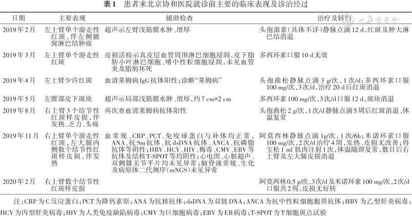 | 2019年3月 | 左上臂单个游走性红斑 | 皮损活检示真皮层血管周围淋巴细胞浸润,皮下脂肪小叶淋巴细胞、嗜中性粒细胞浸润,未见血管炎及脂肪坏死 | 多西环素口服10 d无效 |