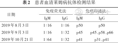 | 2019年8月 | 右上臂3个结节性红斑样皮损,伴发热、乏力、头痛 | 再次查血清莱姆病抗体阳性 | 头孢曲松2 g/次,1次/d静脉点滴5周后红斑消退、体温复常 |